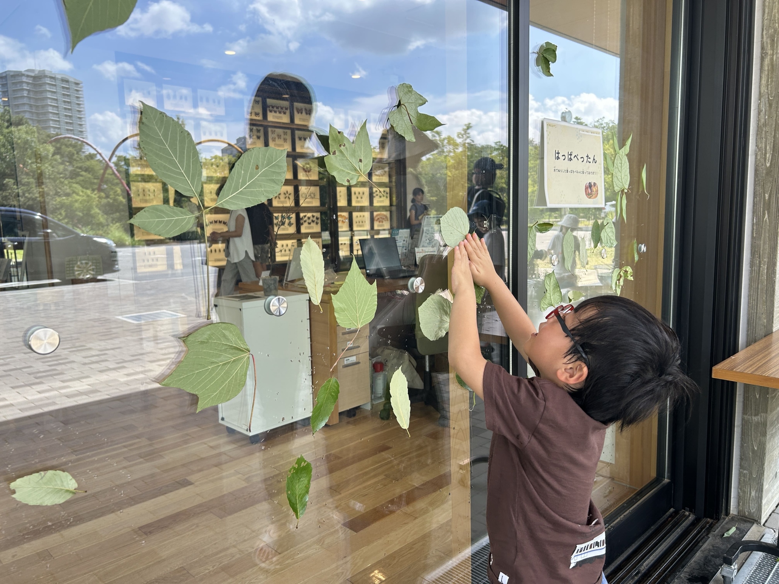 8月のKidsサンデーでは、あさちゃんと、すぎちゃんもプログラムをしました。いろんな葉っぱを使って、いつもとはちょっとかわった不思議な水遊びが体験できる エコロコおやこ 「いろんな葉っぱとお水であそぼ♪」です。