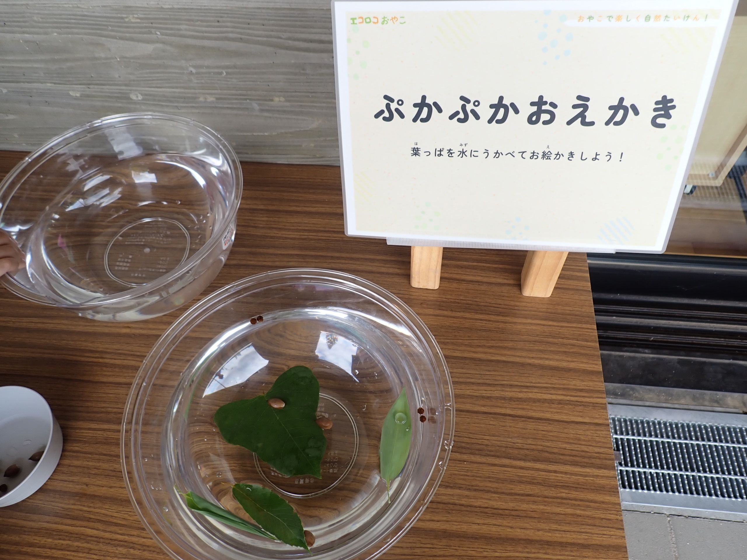 葉っぱとお水の遊びのブース7種を自由に遊んでもらいました。エコロコ訪問プログラム「水のふしぎたいけん」で園児さんと一緒にしている「葉っぱでさかさコップ」は、小学生のお友達にも大人気。水に入れたコップに葉っぱでフタをして、逆さまにしてもこぼれない!?いろんな葉っぱでやってみよう!