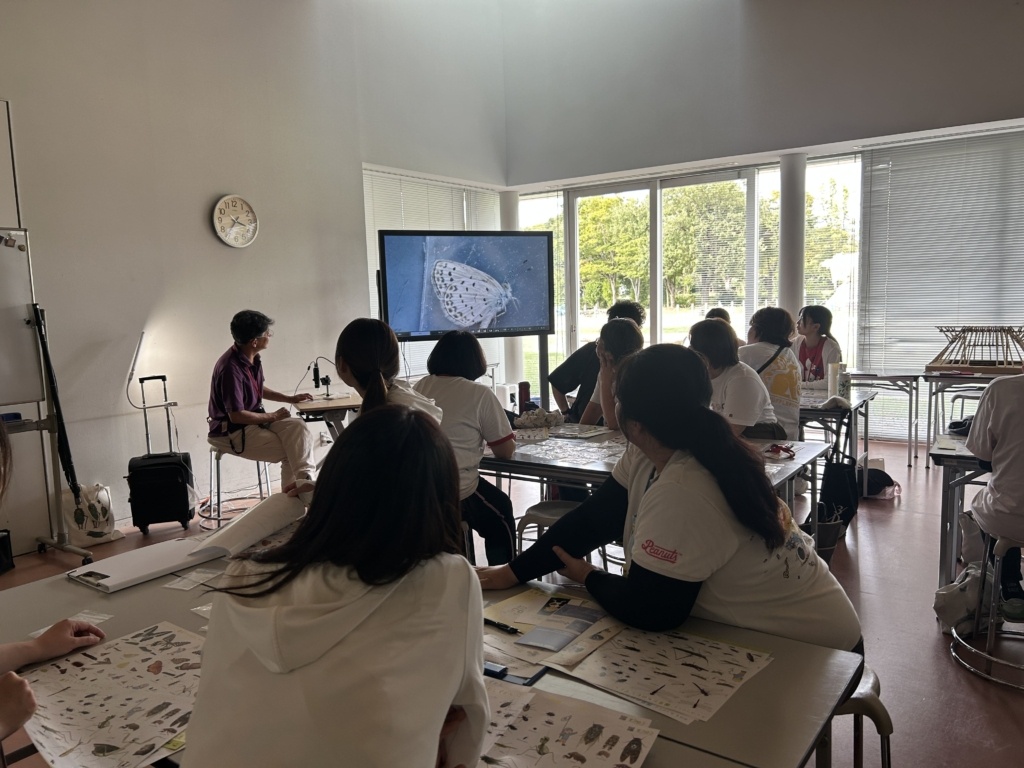 まずは、ひとはく八木主任研究員による「正しいむしの扱いかた」のお話です。先生方に事前に頂いた質問やお悩みにこたえる形で進められました。「むしは乾燥に弱い、乾かないように飼育ケースよりも、タッパーやペットボトルなどで育てる方がよい。」と八木主任研究員(むしはかせ)が話すと、驚きながらも「なるほど~」と頷かれる先生方の姿が印象的でした。