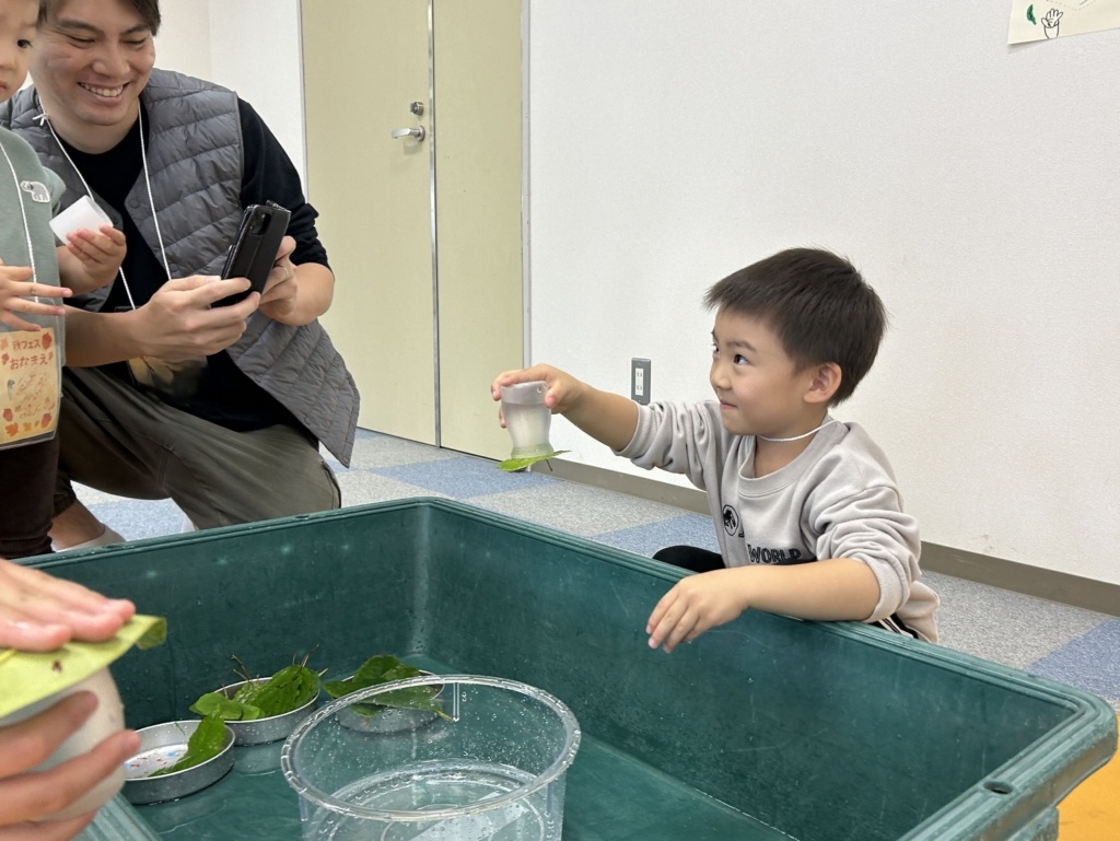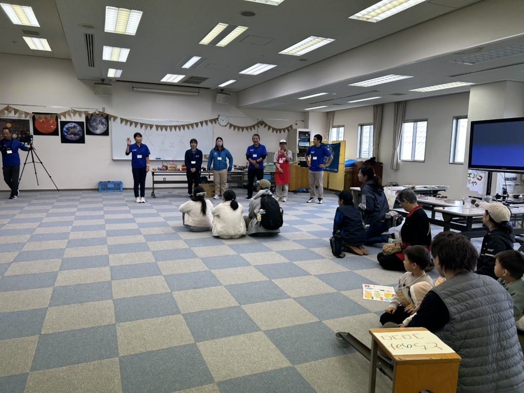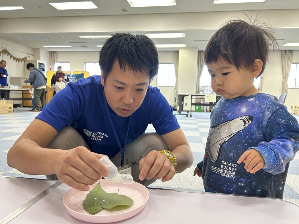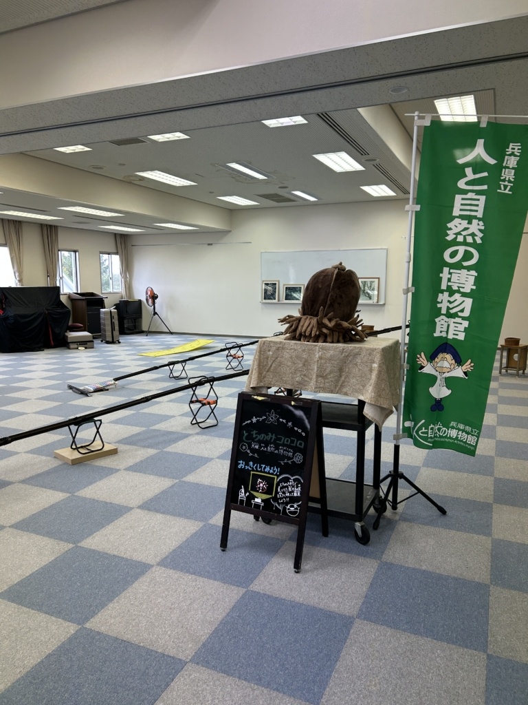 こんにちは!!こども環境体験コーディネーターの河田麻美(あさちゃん)です。先日(2025年10月26日)に兵庫県香美町にあります美方高原自然の家 とちのき村「秋フェス2025~小さい秋をみつけよう~」にエコロコも参加しました。エコロコからは、かーくん(大平主任研究員)、すぎちゃん(杉浦こども環境体験スタッフ)、あさちゃん(河田こども環境体験コーディネーター)の3名で伺い、「とちのみコロコロ」「おっきくしてみよう」「いきものタッチ」「葉っぱの水滴観察」「葉っぱで逆さコップ」といろいろなエコロコプログラムをさせてもらいました。