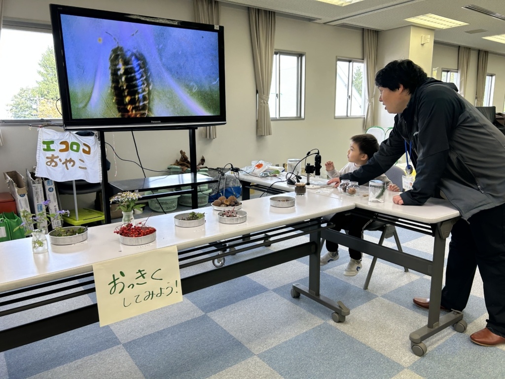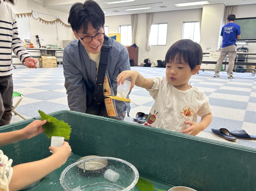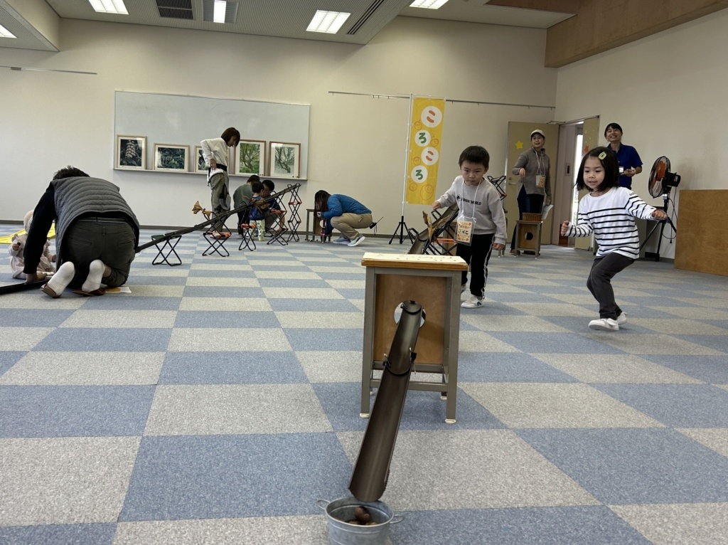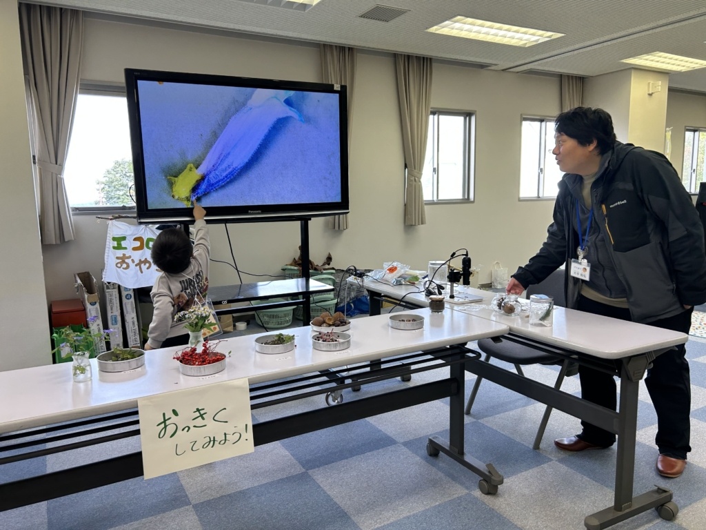 こんにちは!!こども環境体験コーディネーターの河田麻美(あさちゃん)です。先日(2025年10月26日)に兵庫県香美町にあります美方高原自然の家 とちのき村「秋フェス2025~小さい秋をみつけよう~」にエコロコも参加しました。エコロコからは、かーくん(大平主任研究員)、すぎちゃん(杉浦こども環境体験スタッフ)、あさちゃん(河田こども環境体験コーディネーター)の3名で伺い、「とちのみコロコロ」「おっきくしてみよう」「いきものタッチ」「葉っぱの水滴観察」「葉っぱで逆さコップ」といろいろなエコロコプログラムをさせてもらいました。