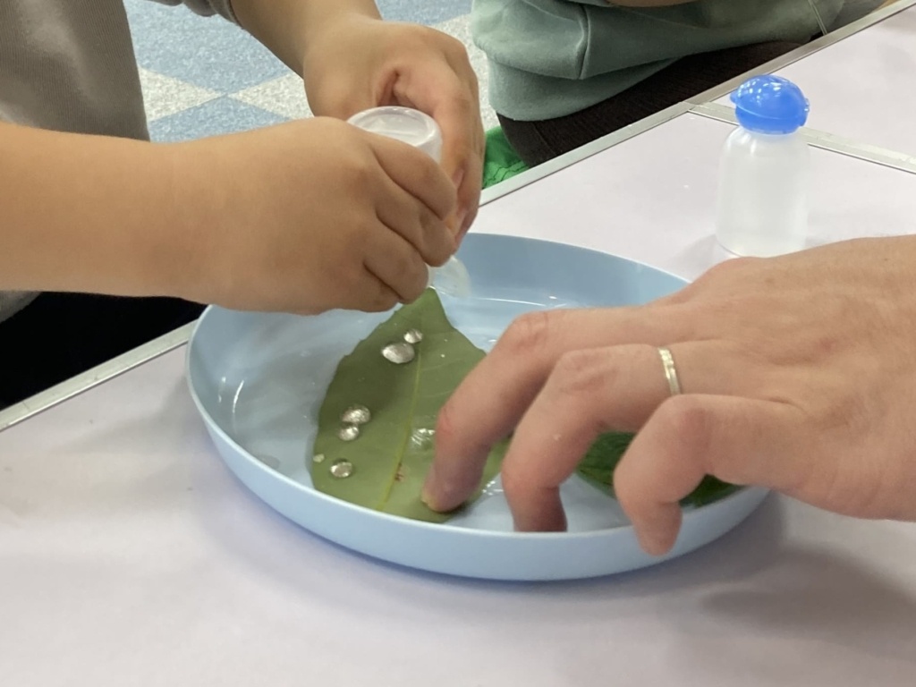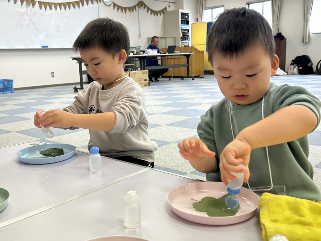 葉っぱとお水のあそびも大人気♡みんな何度も繰り返して遊んでいましたよ。葉っぱでさかさコップが出来た時の表情、とってもいいお顔♡