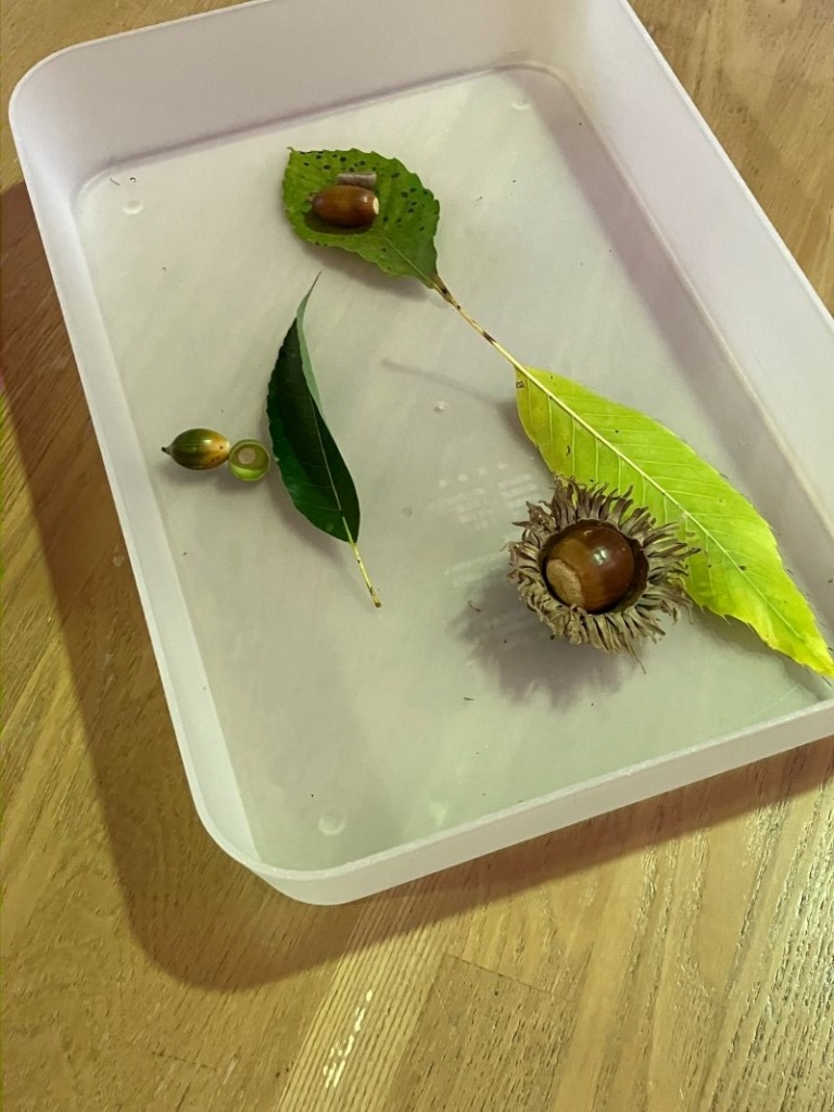 まずはどんぐりのお話。コナラ・クヌギ・シラカシのどんぐり・葉っぱを触ってみます。